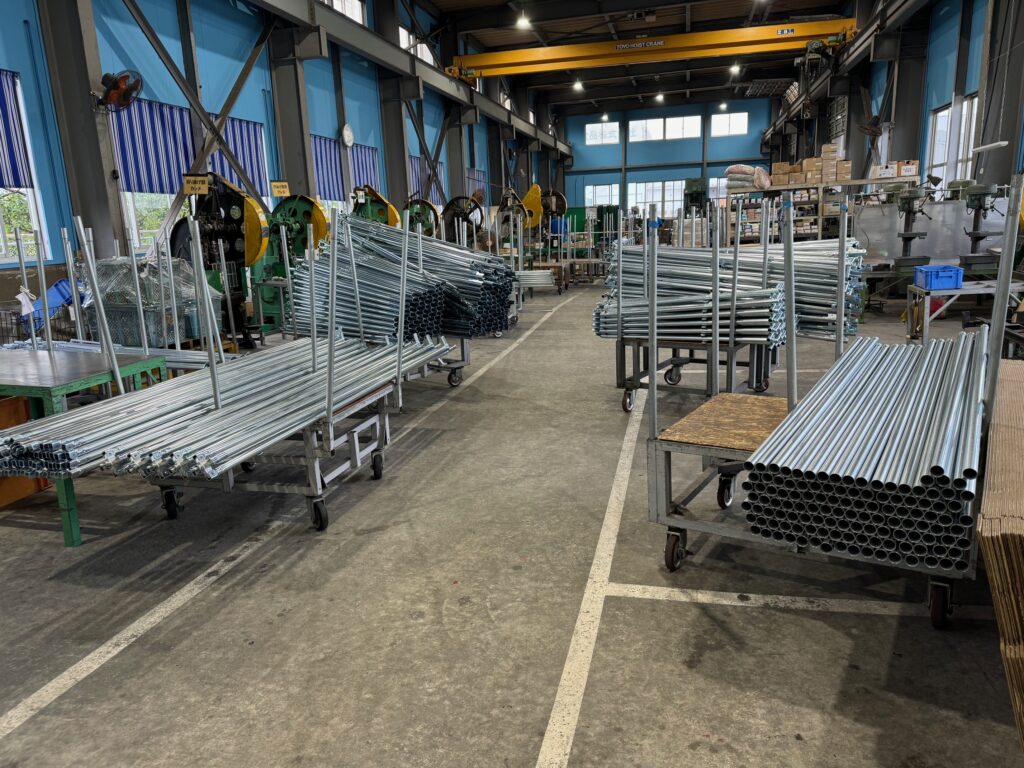 加工前のテントフレームが山積みとなっています。このパイプに部品を付けて、テントフレームが出来上がります。
