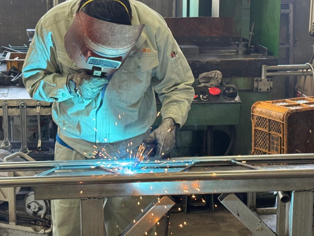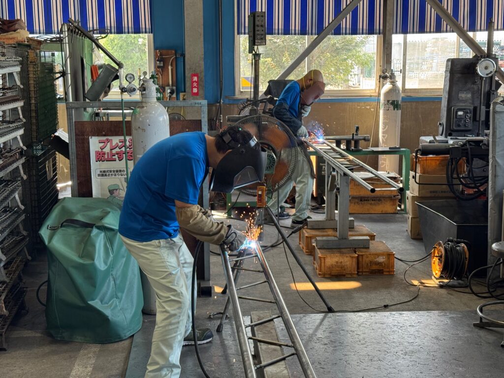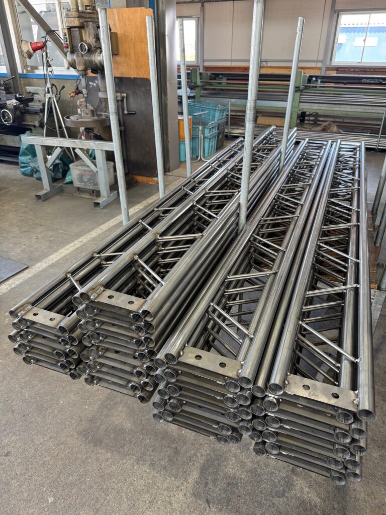 ステージテントや間仕切りブースなどの特注テントに使用する、トラス材もどんどんと溶接されていきます。