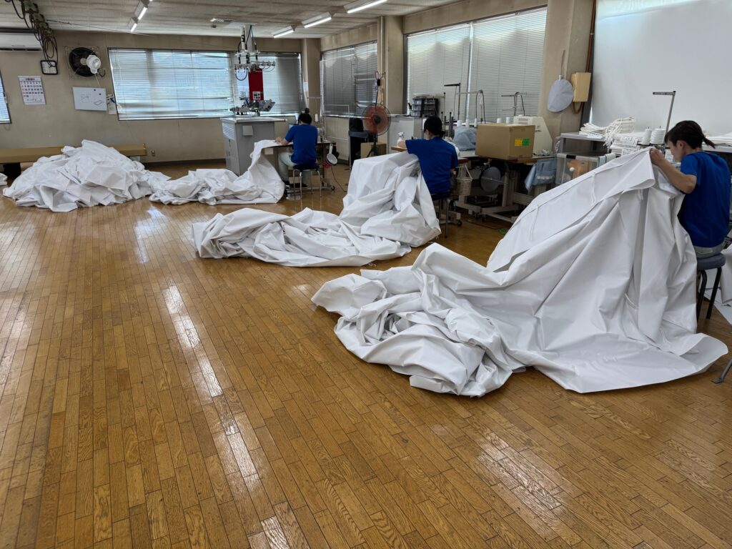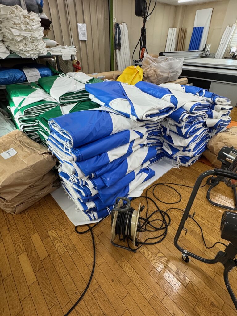 白色だけでなく、ストライプやカラーなど、様々な素材でテントを縫製して、出荷待ちとなっております。