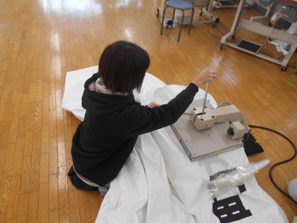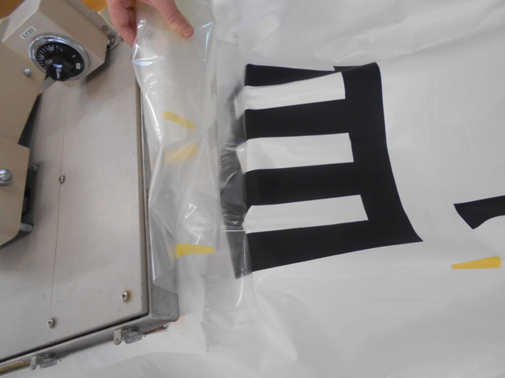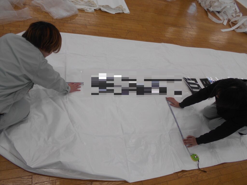 その後、シートを剥がして文字だけをテントに転写し、再度本圧着して完成です。