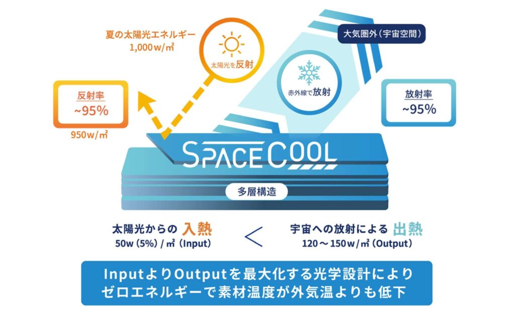 この素材は、放射冷却により熱量を宇宙へと放出する事で、周囲の温度まで下げてしまう、という特性があります。