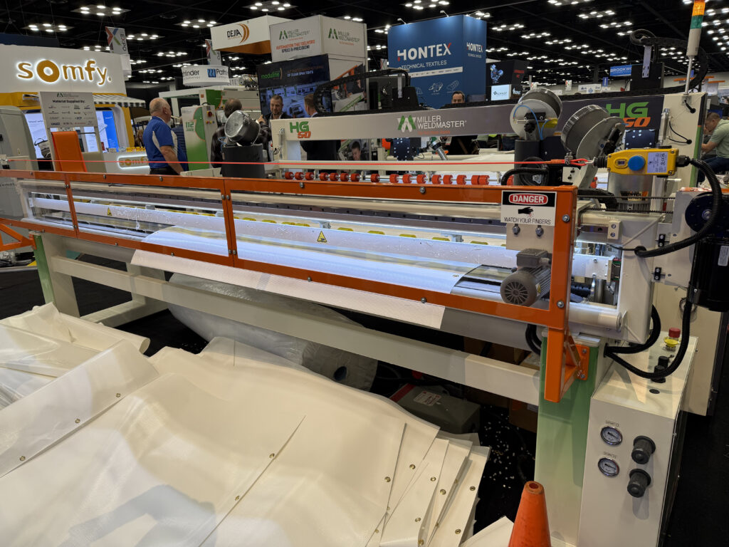 こちらの機械は、反物から自動で両端を折り返し、ハトメ加工をして、裁断まで自動で行うオートメーションシステムです。