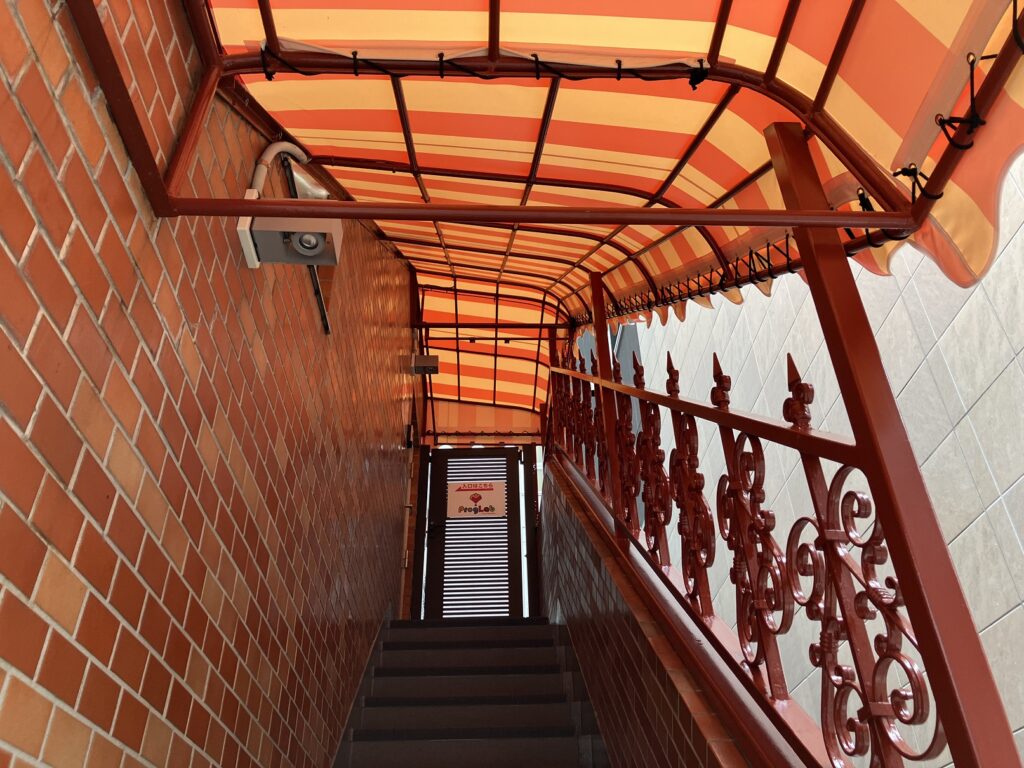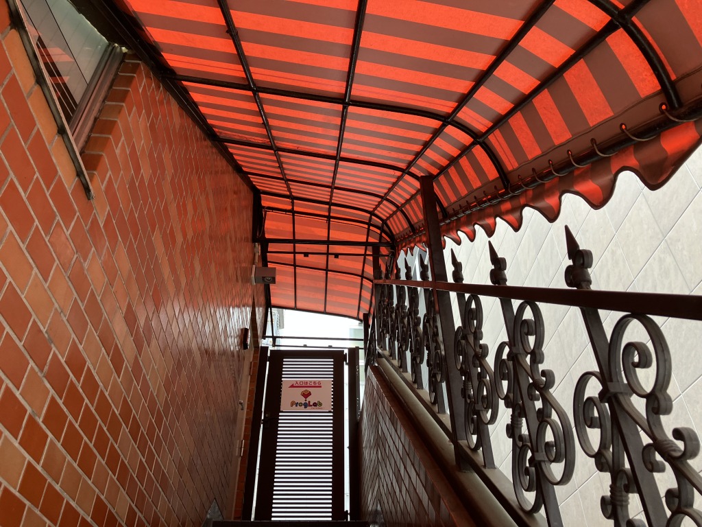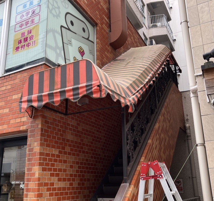 東京都内で店舗様の階段上テントのシート交換を行いました。