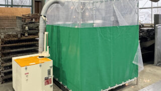 溶接ヒューム対策用の作業ブースです。ブース内をヒューム集塵機で局所換気する事で、作業者と周囲へのヒューム拡散を防ぎます。アーク光対策にも配慮し、工場内のあらゆるスペースへ配置可能です。